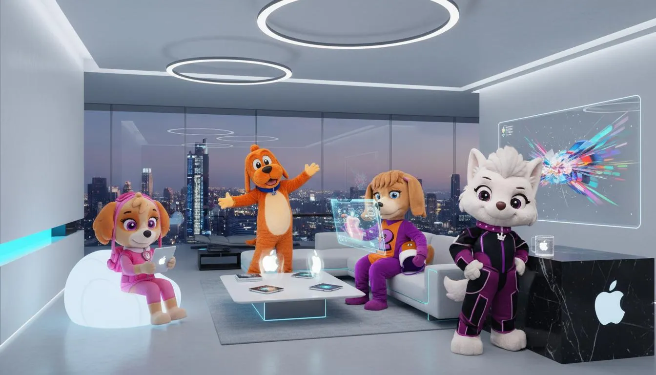 Generate 4 adorable anime-style dog mascot girls living in a sleek Apple iHouse with this AI prompt! Create vibrant, detailed scenes using vivago.ai's powerful image generator. Ideal for anime fans, mascot design, and unique creative prompts.