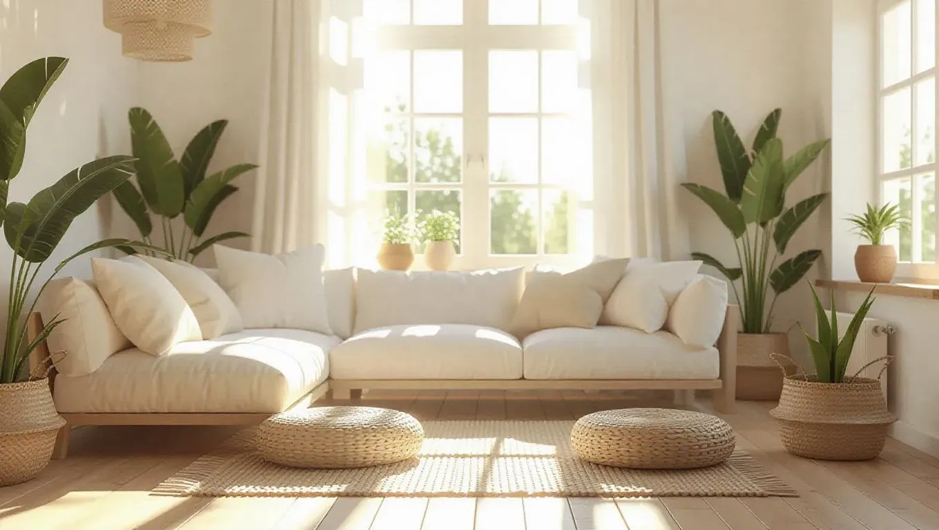 Boho-style village house living room with airy beige & white tones, golden accents, and lush plants. Photorealistic interior design bathed in natural daylight, wide-angle perspective, serene ambiance, no clutter. High-detail, joyful decor with soft sunrays and fluffed cushions—energetically clean, bright, and inviting. Perfect for light-filled, calm spaces inspired by bohemian aesthetics.