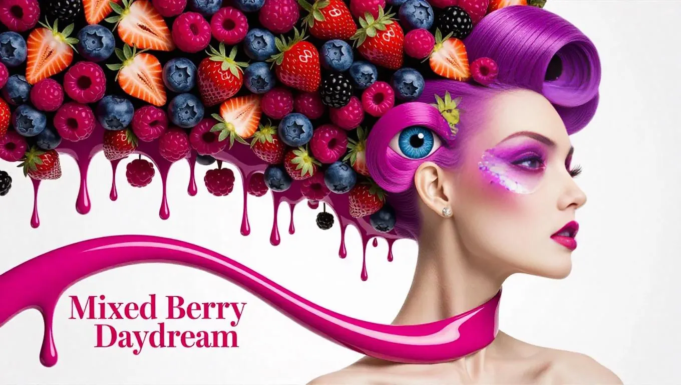 ## Mixed Berry Daydream a surreal side profile portrait of a woman with one dramatically large, wide eye visible from her elegant profile, reflecting a kaleidoscope of berry juice and sparkles. Her elongated neck curves horizontally like a graceful vine, creating a sweeping diagonal across the composition. Her profile reveals a delicate nose and lips stained with mixed berry juices. Her candy-colored hair doesn't explode upward but surges horizontally behind her in an anti-gravitational eruption of berries—strawberries, blueberries, raspberries, blackberries—all twirling into floral swirls and translucent drips that stretch toward the edge of the frame. Her vine-like choker wraps asymmetrically around her extended neck, anchored with glowing berry clusters that trail backward rather than downward. Her skin shimmers with the hues of ripe fruit, catching prismatic light along the edges of her silhouette. A single earring of cascading berries adorns her visible ear, creating a vertical accent against the horizontal flow. The background is a painterly burst of swirling berry juice that recedes into perspective, with glittering stars and ornamental Art Nouveau patterns forming architectural structures along horizontal sight lines. Vibrant, magical, and deliciously surreal, emphasizing the fruity sweep of her profile against the berry-drenched dreamscape.