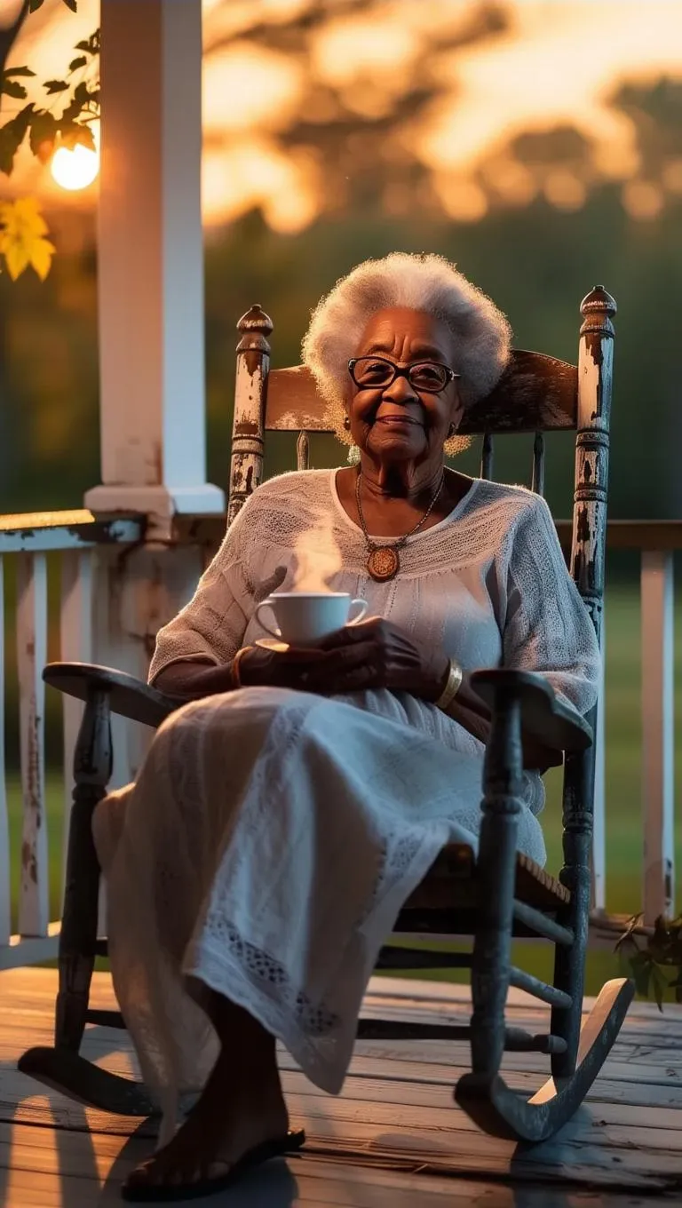 Create a lifelike AI-generated portrait of a wise African American grandmother with glasses, smiling softly in a rocking chair. Vivago.ai transforms text prompts into vivid AI artwork, capturing warm details like a teacup, Bible, and knowing gaze for heartwarming visual storytelling.