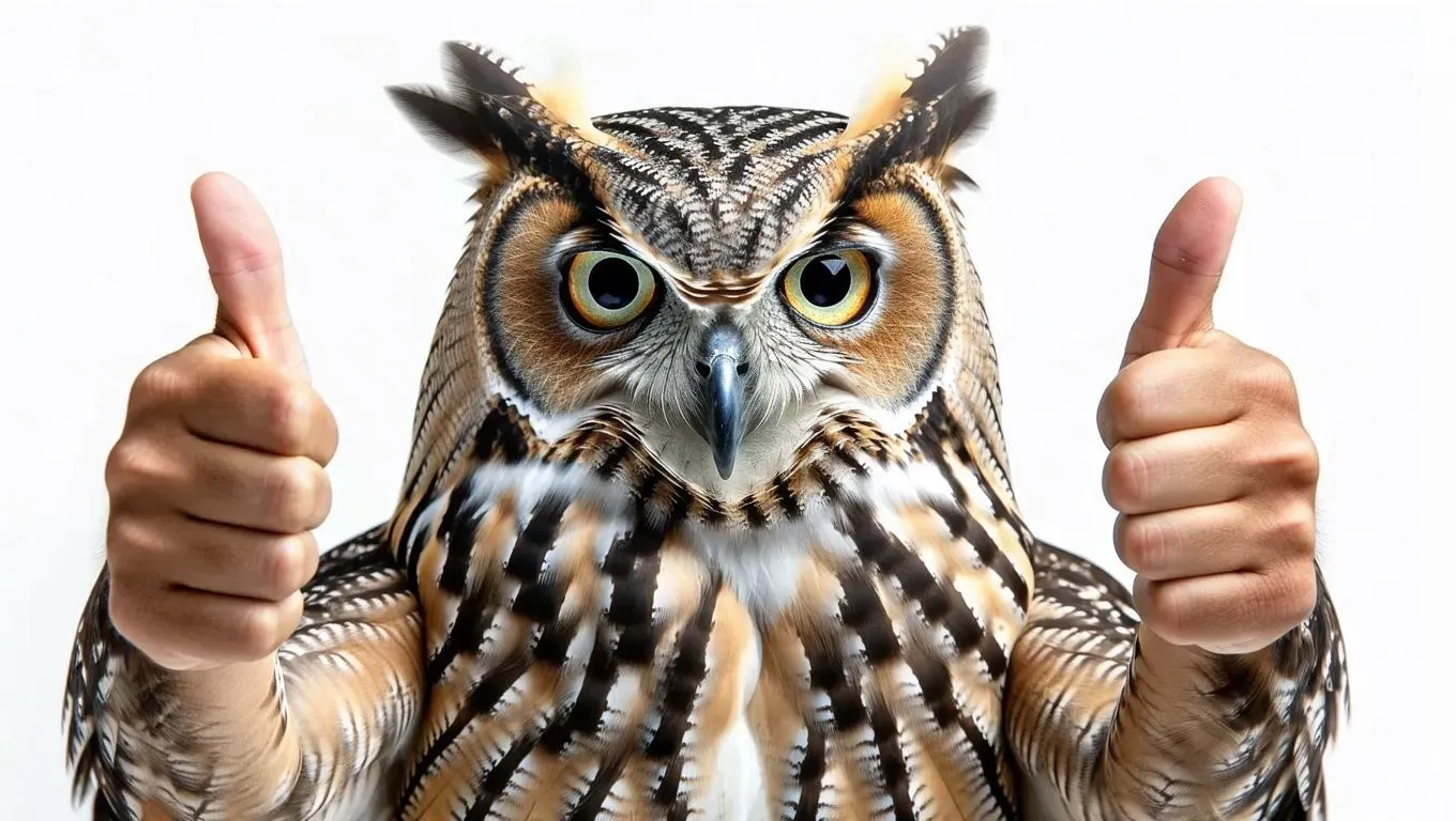 Generate an AI-powered cartoon owl image with a cheerful thumbs-up gesture on a clean white background. Ideal for memes, branding, or playful digital content. Explore VivaGO's AI tools for customizable anthropomorphic animal art, high-resolution visuals, and attention-grabbing designs perfect for social media, ads, or creative projects.