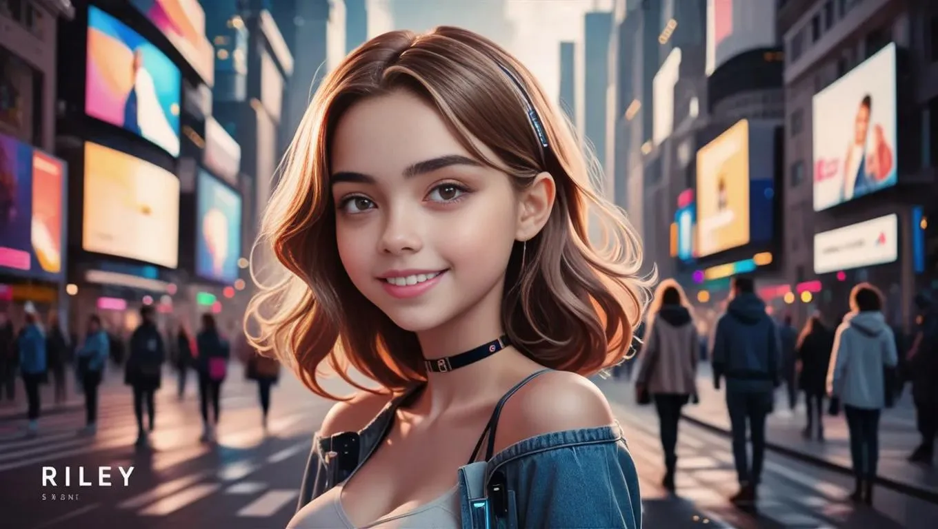 Meet Riley, the AI-generated model embodying natural beauty with a tech twist. Her casual style—jeans, trendy top, and subtle wearable tech—blends modern fashion and futuristic flair. Set in a vibrant urban scene with digital billboards, she showcases an approachable, AI-enhanced look: soft waves, glowing skin, and warm hazel eyes. Perfect for brands seeking relatable, down-to-earth yet innovative visual storytelling.
