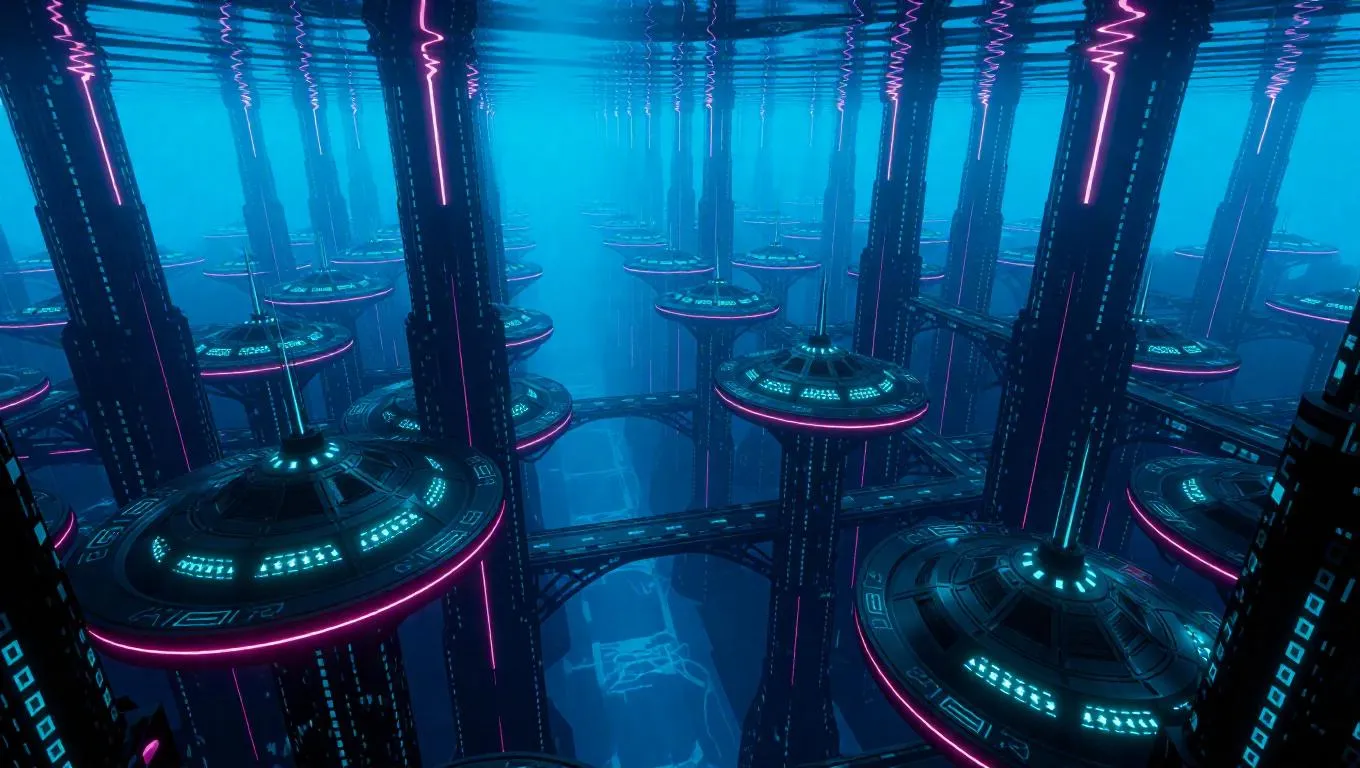 Explore a hyperrealistic underwater megacity from a bird's-eye view. Marvel at towering glass spires, neon-lit panels, and suspended bridges bathed in prismatic light. This AI-generated scene captures iridescent neon highlights and a sprawling, multilevel metropolis. Perfect for futuristic, neoncity themes. Transform your vision into stunning visuals with VivaGO.ai's AI-powered creative tools.