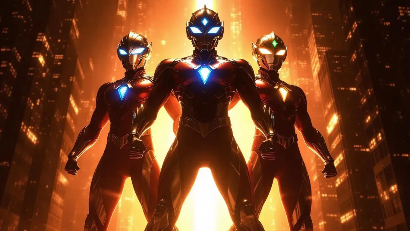 Heroic Ultraman Orb, Tiga, and Ginga unite in a high-energy illustration with glowing auras, futuristic cityscapes, and cinematic lighting. Bold, detailed art captures their legendary strength and unity in this dynamic, action-packed AI-generated scene. Perfect for fans of iconic Ultraman characters and vibrant, professional-grade anime-style visuals.