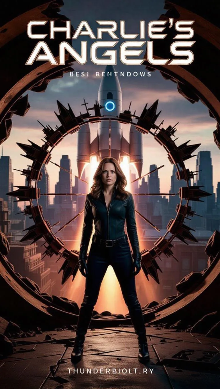 Charlie's Angels' Charlie Townsend (Thunderbolt) stands in front of a dimensional rift, where a mechanical storm merges with a Thunderbolt rocket, set against the ruins of a shattered future city. Thick paint technique highlights mechanical parts and metal reflections, with scraper technique showing rough textures inside cracks. Rusty metal and mechanical wear textures from Substance library. Rendering sampling rate >5000, crack light source brightness +50%, color temperature 8000K, main light vs ambient light difference 4000K, stroke direction aligned with mechanical motion. Multi-layer rendering, Blend Mode Overlay. Avoid natural elements, disable soft filters, reject cartoonish war gear, exclude non-Cyborg organisms.
