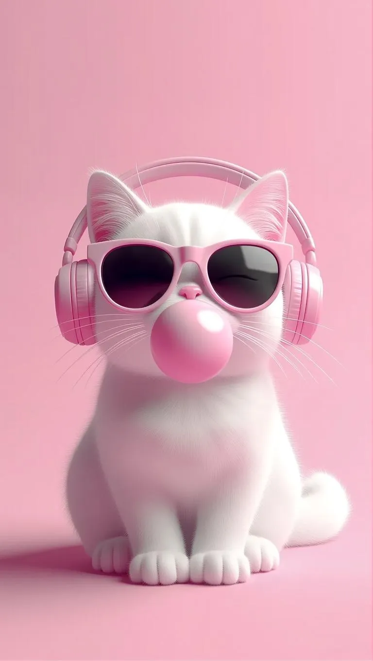 简单的 3d 可爱插图, 一只戴着粉色太阳镜和耳机的白猫,在纯粉色的背景下吹着泡泡糖,以Loish的风格创作的数字艺术,超现实主义肖像摄影,获奖摄影作品。