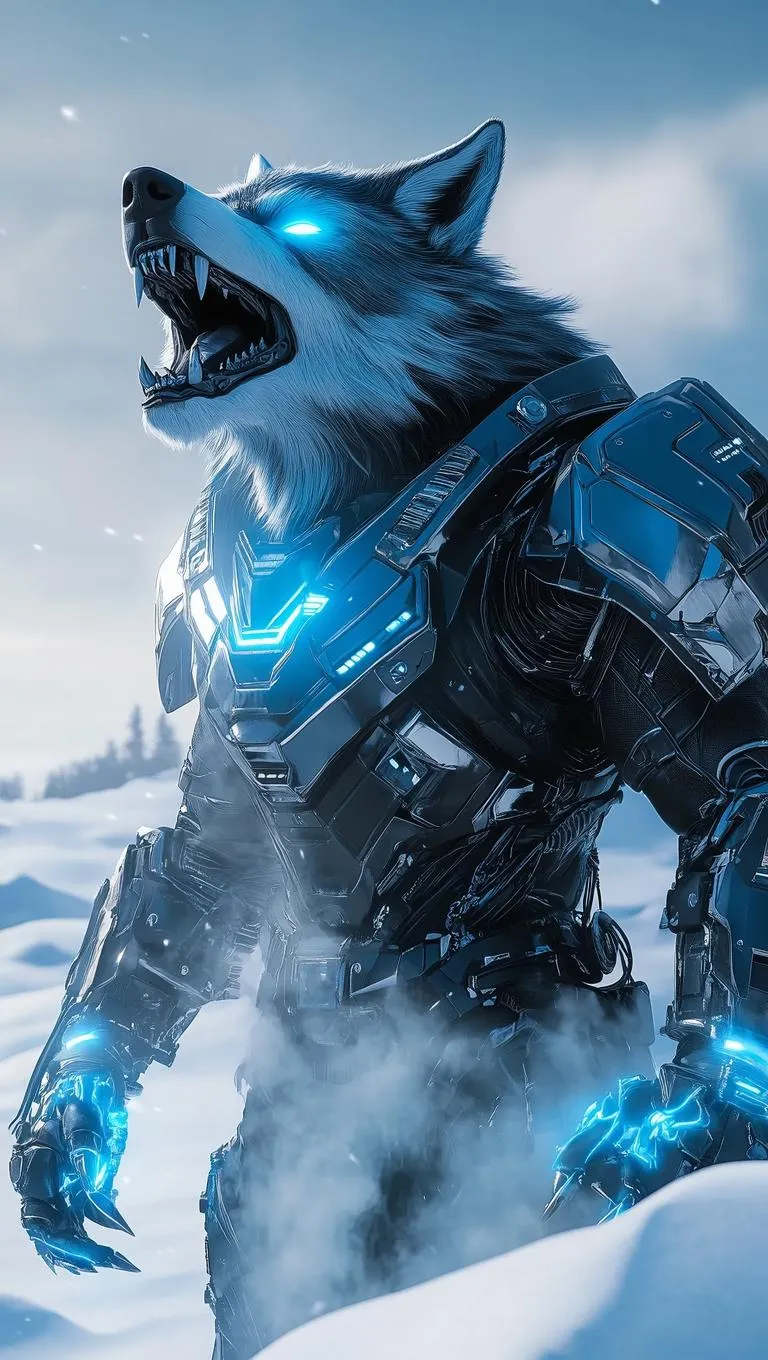 Wolf-based cybernetic warrior with icy blue chrome armor and glowing claws, rendered realistically in a snowy wilderness. Vivago.ai transforms text prompts into striking AI art, featuring smoke, steam details, and hyper-realistic rendering for professional-grade cyber predator designs.