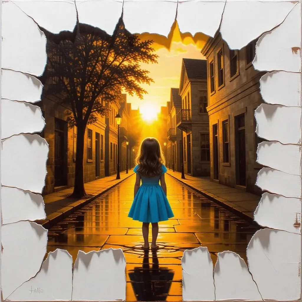 Immerse in a magical, serene AI-generated surreal oil painting blending reality and fantasy. A realistic girl in a blue dress stands at a torn canvas edge, revealing a glowing sunset street with nostalgic buildings, golden light, and impressionist textures. Dreamlike transitions merge soft abstract brushstrokes with vivid details, evoking childhood wonder through ethereal artistry. Transform prompts into visual poetry with Vivago.ai's AI creativity tools.