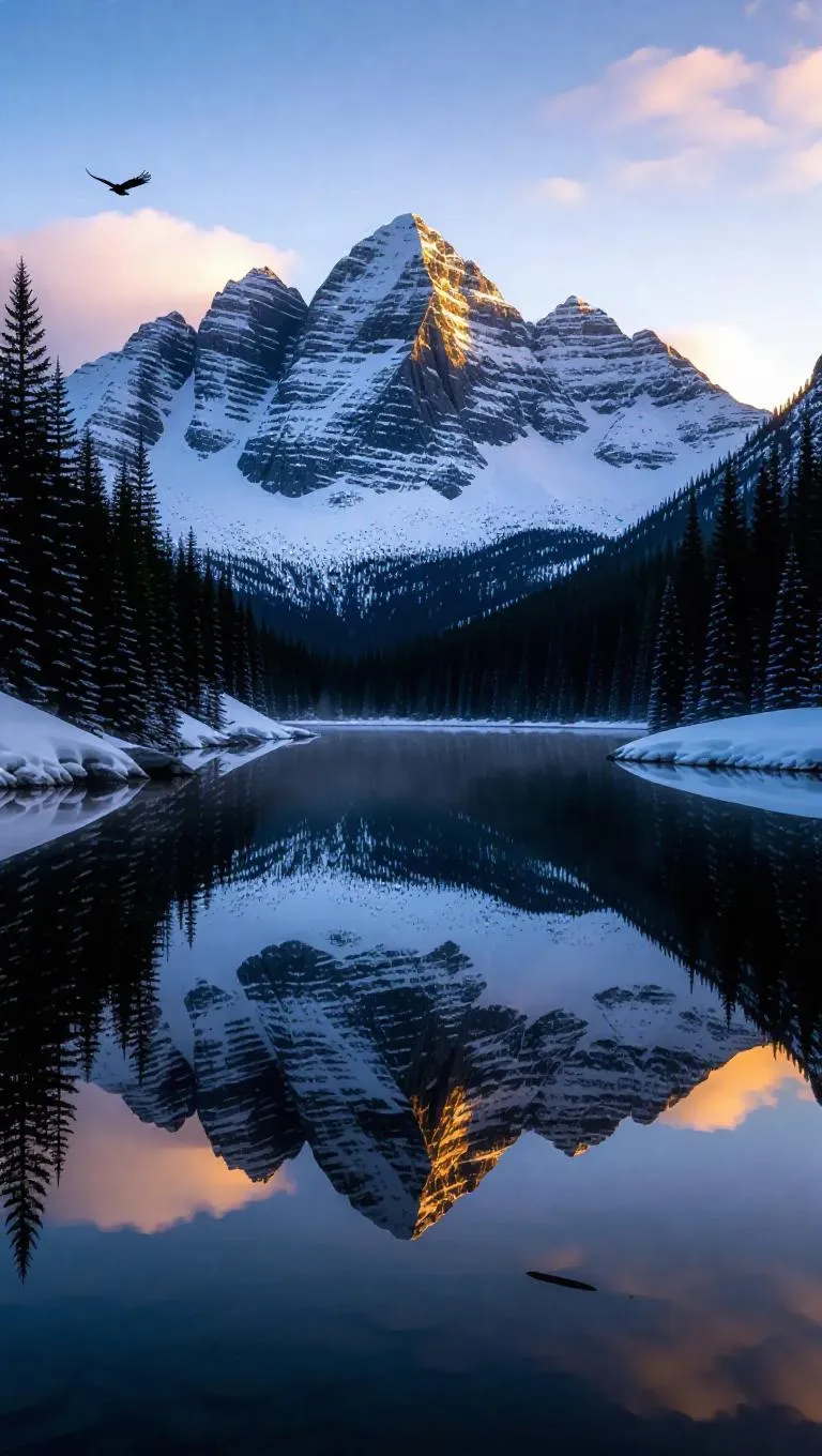 Capture pristine alpine grandeur with this ultra-detailed 8K scene of snow-capped peaks glowing under twilight. Crystal glacial lakes mirror jagged ridges, ice formations, and drifting clouds. Serene stillness meets dramatic scale—morning mist clings to frozen waterfalls while an eagle soars through crisp air. Wide-angle realism balances primal wilderness beauty with perfect reflections in this majestic mountain panorama.