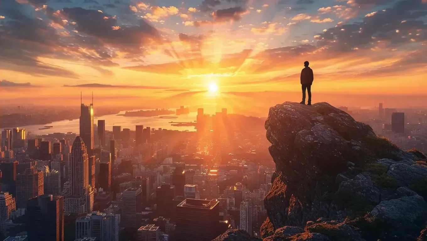 Create a stunning AI-generated sunrise animation video with a cityscape backdrop. A lone figure on a cliff gazes at vibrant dawn hues, symbolizing fresh beginnings and opportunities. Perfect for inspirational content, ads, or storytelling. Use VivaGo.ai's AI effects for professional-grade animations blending nature, urban landscapes, and symbolic depth effortlessly.