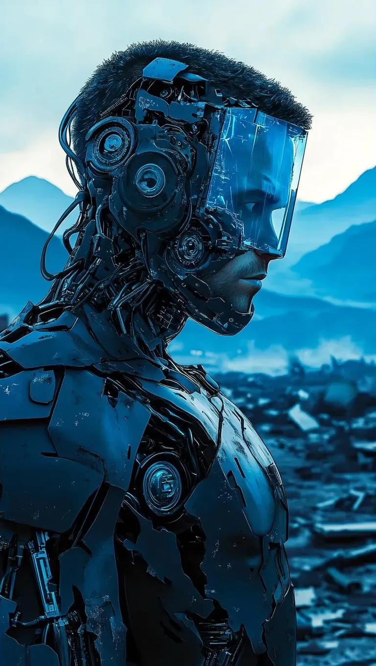 Generate cyberpunk AI art with SCI_FACTOR_CORE: Android humanoid robot with open cyborg mask revealing mechanical parts, set in a vast battlefield against mountainous terrain. Explore ckgr-style concept art and digital effects for professional-grade visuals using vivago.ai's AI tools.