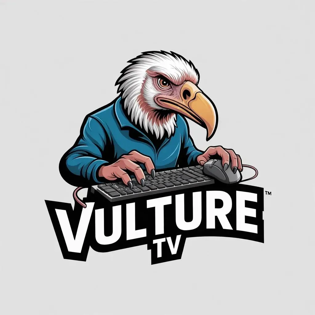 Generate a bold, AI-crafted logo featuring a vulture-faced character interacting with a stylized mouse and keyboard, topped with "VULTURE TV" in edgy block letters. Perfect for branding, streaming, or gaming—transform your vision into striking visuals with AI precision.