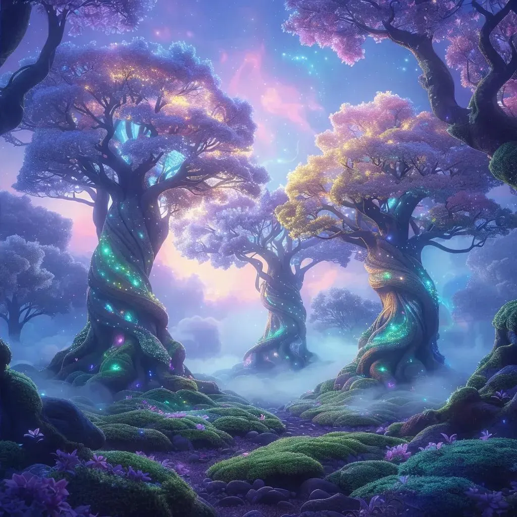 Generate mystical fantasy-style AI art with three central enchanted trees using vivago.ai. Transform text prompts into vibrant, ethereal forests featuring magical lighting, whimsical details, and professional-grade mythical landscape imagery through advanced AI effects and editing tools.