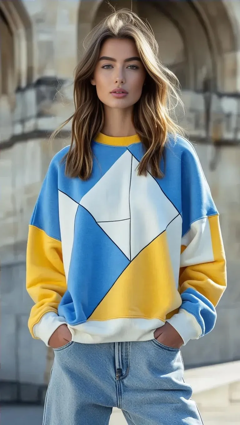 Explore AI-generated fashion with this spring-summer streetwear design: geometric lines, gingham patterns, and hippie-futuristic fusion. Features a light-brown-haired model in an asymmetrical sweatshirt, triangle denim skirt with tassels, hipster details, and stylish heels. Modern casual wear in blue, white, yellow tones. Full-body view on a plain gray podium—youthful, edgy, AI-crafted aesthetics for trendy apparel visuals.