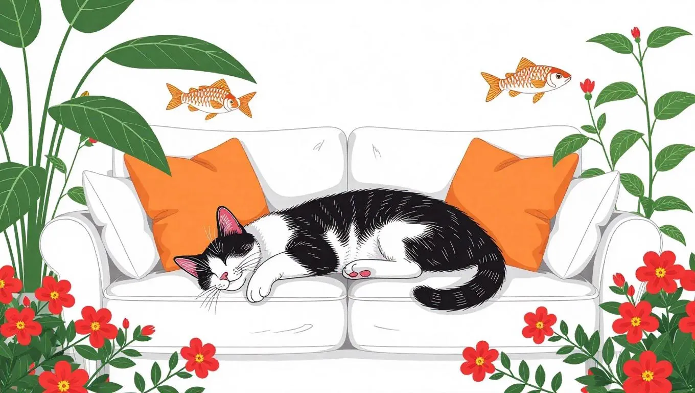 Create a hand-drawn pen sketch of a slender cat lounging on a sofa, blending National Tide aesthetics with Big Fish and Begonias motifs. AI-generated artistry for cozy home scenes, featuring delicate details and a crisp white background. Perfect for cultural-inspired, minimalist visual storytelling.