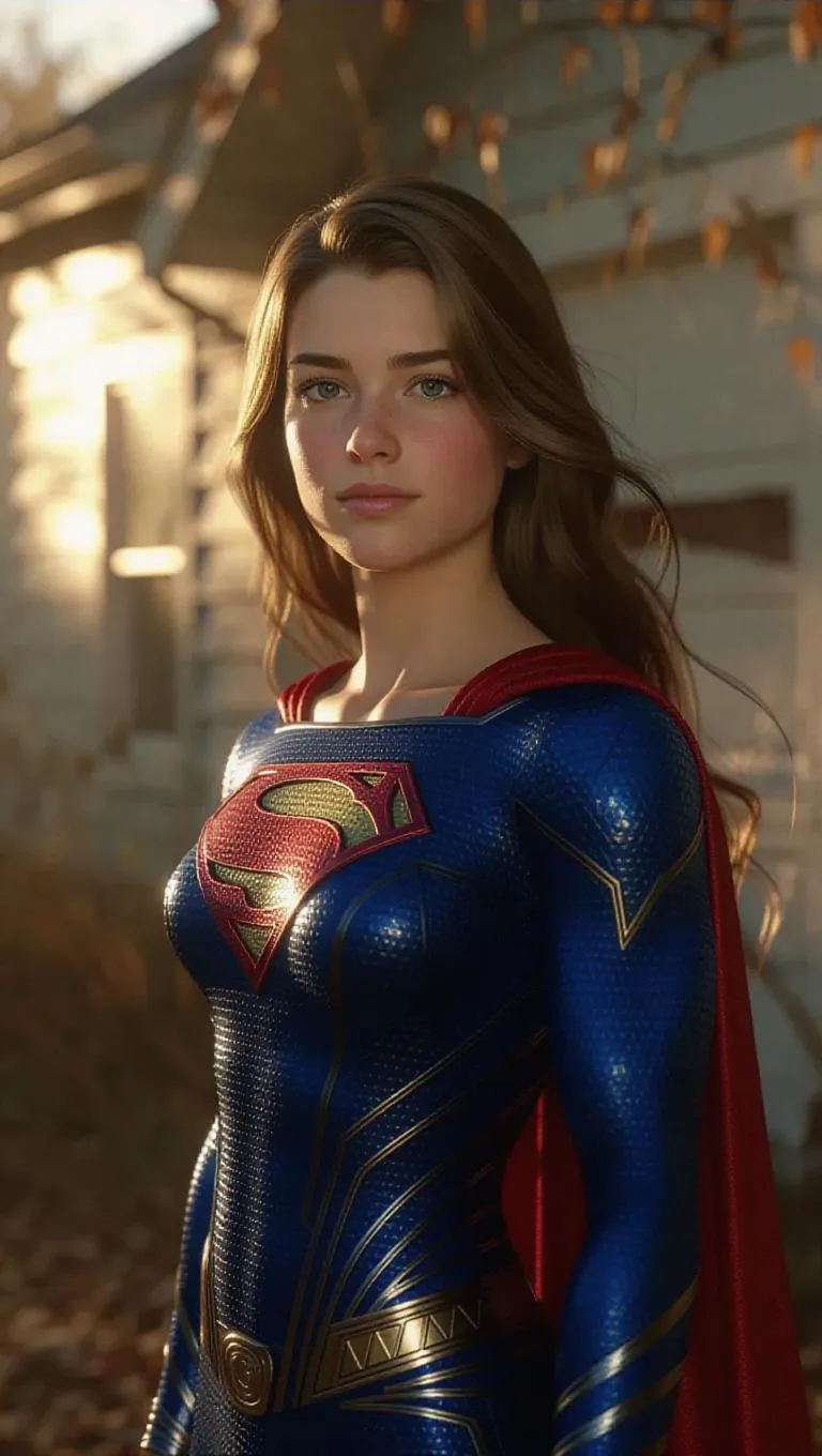 Semi Realistic, 3D rendered, cold colors, close-up shot, highly detailed, 22-year-old supergirl standing in front of her simple house, gentle smile, soft lighting, subtle shadows, crisp textures, serene atmosphere, no text.