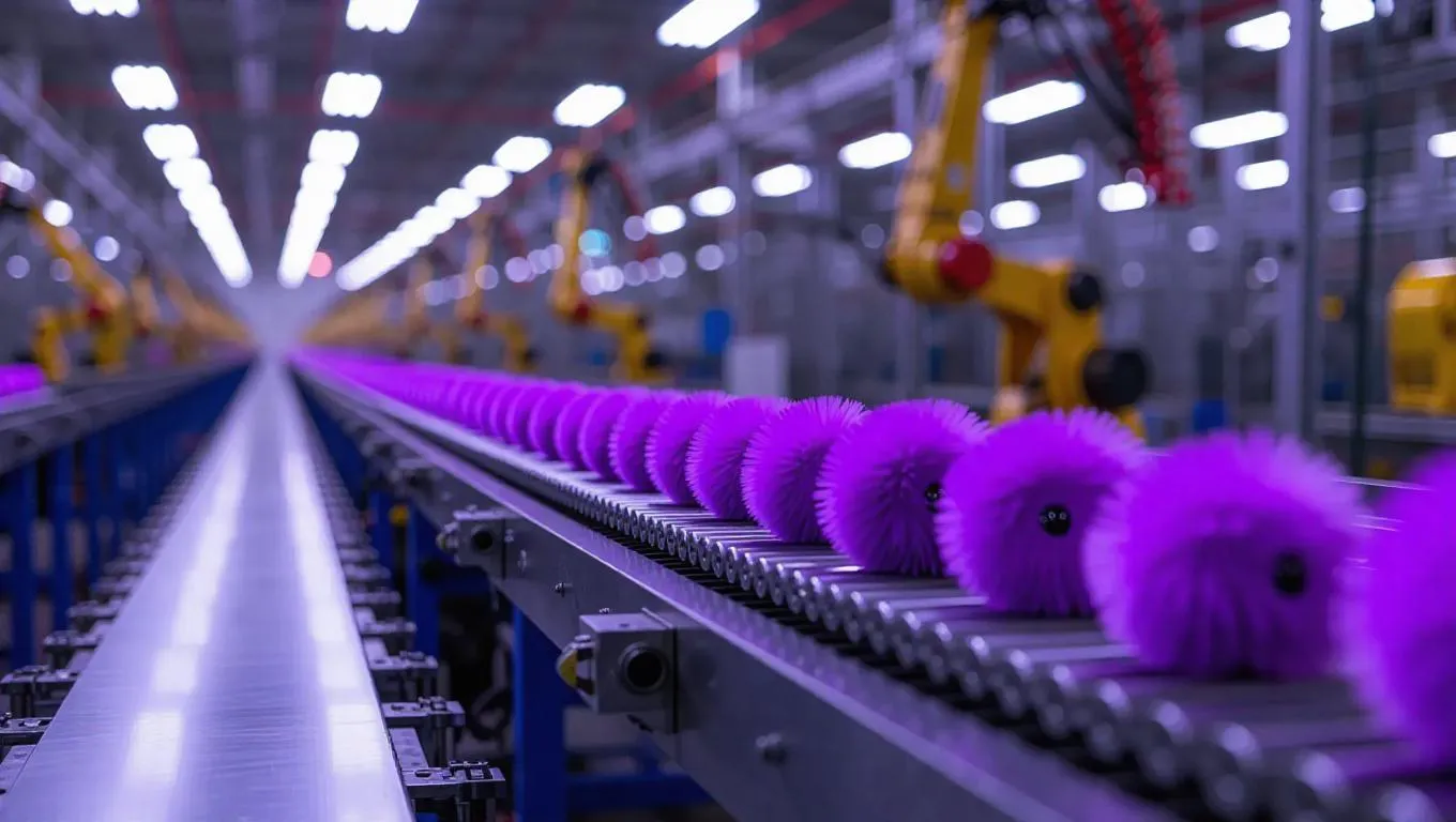 A bustling factory conveyor belt with a single type of purple fluffy toy being meticulously assembled, each toy perfectly aligned, under the glow of industrial lights, with robotic arms and machinery in the background, creating a seamless blend of modern technology and playful charm.