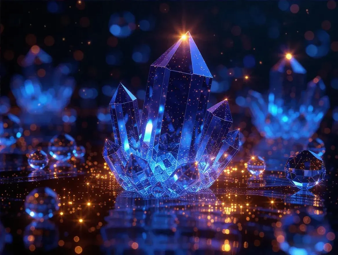 3D animation Disney style, one massive and breathtaking crystal in a dark, star-studded universe, surrounded by smaller crystals gently floating around it, with flashes of light and glittering sparks, exuding a magical aura.