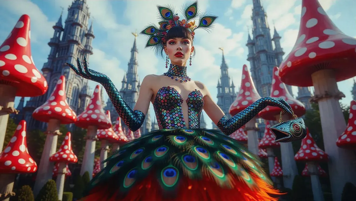 Craft hyper-realistic AI images of avant-garde fashion with surreal cityscapes. Generate a Weirdo Wizo magazine cover featuring a model in a peacock-feather gown, dragon-claw boots, and a talking fish-head purse. Explore AI-generated surrealism with mushroom-shaped skyscrapers, scissor streetlights, and low-angle aerial photography for striking, professional-grade visuals.