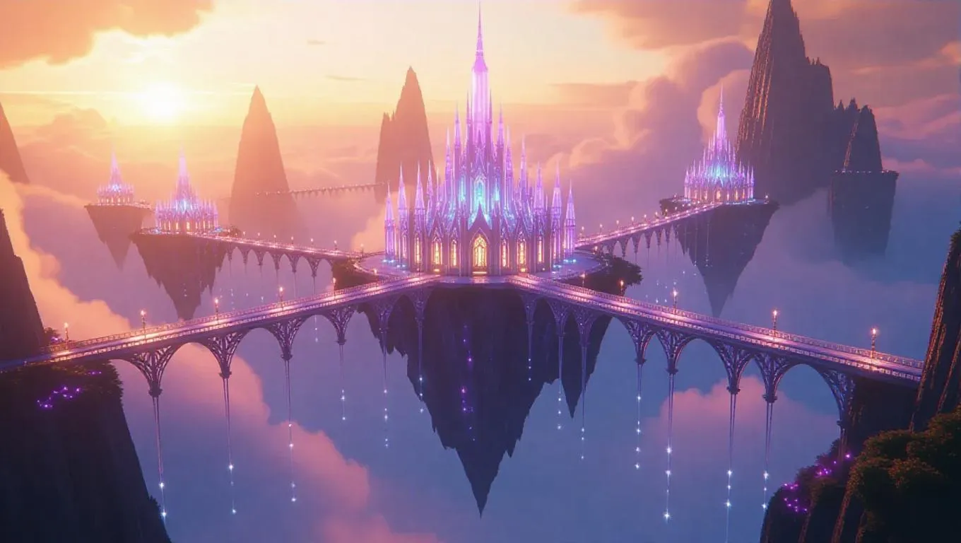 A majestic crystal palace floating serenely in the sky, connected by ethereal, delicate bridges to shimmering floating islands. The palace glows with a soft, otherworldly light, surrounded by wispy clouds and vibrant, glowing flora. The bridges, adorned with intricate patterns, span the vast, starlit expanse, creating a dreamlike and enchanting scene.