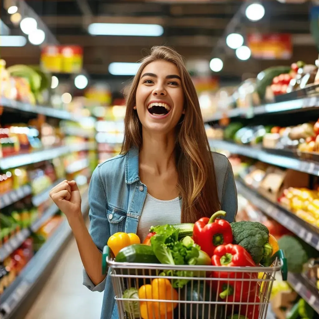 Generate a vibrant AI image of a cheerful young woman celebrating grocery store discounts, smiling brightly with a basket full of fresh produce. Dynamic sale tags, colorful discount signs, and lively store ambiance highlight savings. Perfect for marketing visuals, social media, or promotions—crafted with AI effects for energetic, budget-friendly shopping excitement.