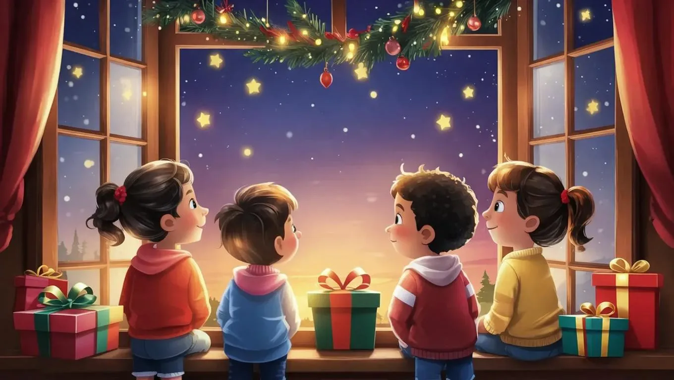 Cartoon-style illustration of children marveling at dawn light on Christmas morning. Gifts under the tree, festive window view, and vibrant AI-generated art capture childhood wonder and holiday magic. Whimsical, colorful scene blending playful animation with serene early-morning atmosphere. Perfect for greeting cards or seasonal storytelling visuals.