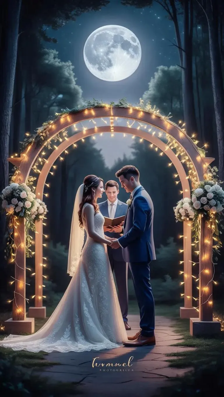 Create enchanting AI wedding visuals with moonlight vows. Generate serene, magical scenes featuring softly glowing couples under moonlit arches using AI image tools. Perfect for romantic, professional-grade wedding content with warm lighting effects and ethereal atmosphere enhancements.