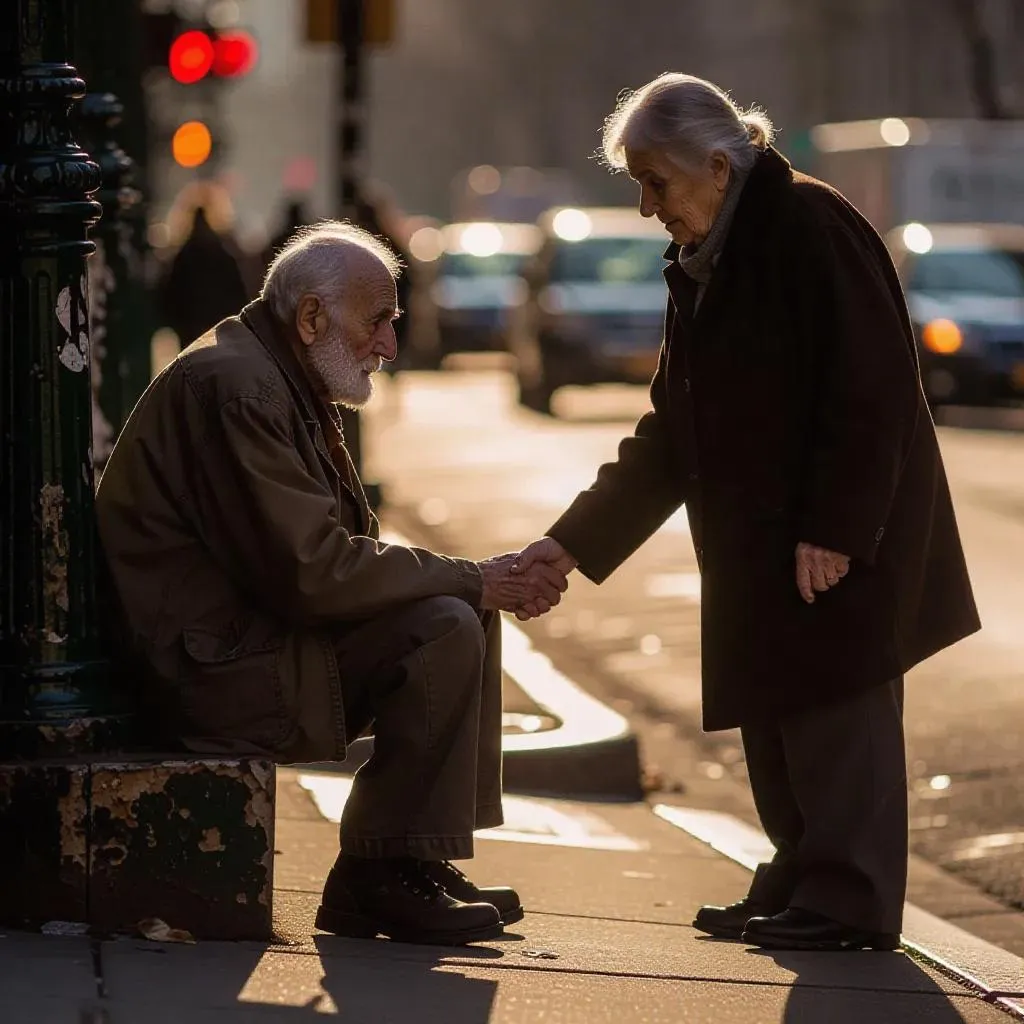 Capture a heartfelt scene of compassion with AI-generated visuals: elderly homeless man receives charity from a kind woman. Ideal for storytelling, social campaigns, or emotional content. Create vivid, professional images effortlessly using Vivago.ai's AI tools for realistic social narratives and impactful visual storytelling.