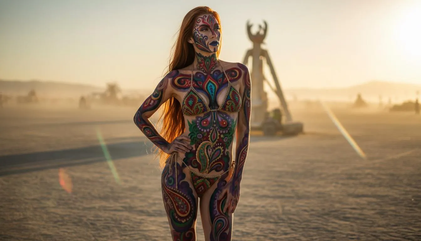 DRAMATIC FULL-BODY PORTRAIT at Burning Man Festival, capturing every inch from head to toes of the world's most beautiful SLIM woman with LONG FLOWING RED HAIR cascading down her back, COMPLETE body INCLUDING FACE, eyelids, lips, eyebrows, forehead flawlessly covered in intricate paisley bodypaint with ZERO visible normal skin. FACE FULLY PAINTED with vibrant teardrop paisley in crimson red, sapphire blue, emerald green, gold, amethyst purple, flowing across every feature. SLENDER athletic figure, scant crocheted bikini matching paisley pattern – delicate yarn triangles barely covering firm breasts, thin string ties on narrow hips. Burning Man dust swirls around feet, distant art installations glow on Black Rock desert horizon, golden hour lighting with lens flares. Ultra-precise airbrush creates 3D shading on cheekbones, NO UNPAINTED AREAS – total saturation from scalp to soles. Graceful pose, high-fashion festival aesthetic, hyper-realistic bodyart, 8K resolution, cinematic depth of field.