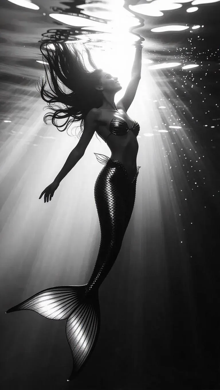 Deep beneath the surface, a joyful mermaid dances in a dreamlike underwater scene, her flowing hair creating mesmerizing patterns as it drifts weightlessly in the current. Tiny bubbles sparkle like stars around her, adding a magical aura. Dramatic black and white tones highlight her graceful movements, from her genuine smile to the delicate scales that catch the light, capturing the pure freedom and magic of ocean mythology.