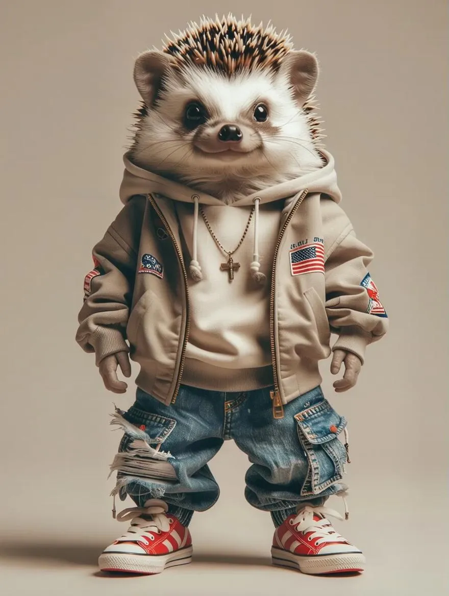 Generate a hyperrealistic anthropomorphic hedgehog in streetwear, standing upright on two legs. Full-body shot with neutral background using vivago.ai's AI art tools. Create striking digital characters from text prompts effortlessly.