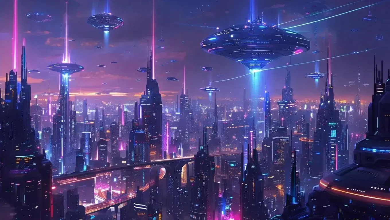 Generate a cyberpunk-inspired futuristic cityscape with glowing neon architecture, hovering vehicles, and advanced tech elements. Create AI-generated visuals of a vivid nighttime metropolis, blending sci-fi ambiance with cutting-edge urban design for immersive cyberpunk imagery and dynamic cityscapes.