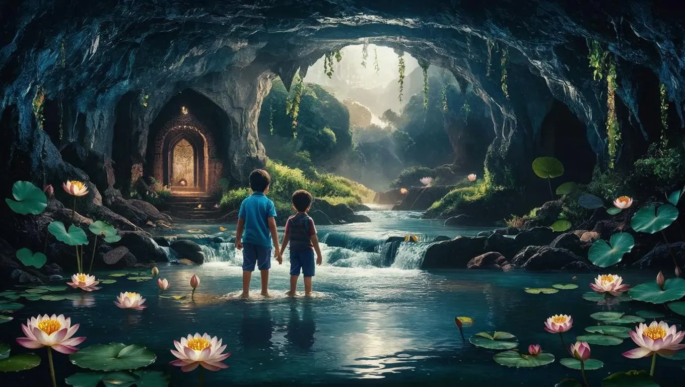 Create stunning AI-generated visuals of Rajkumar Aryan and Yug's cave adventure with a lotus-filled river using VivaGo.ai. Transform text prompts into magical scenes with vivid details, AI effects, and professional editing tools for lifelike fantasy landscapes. Ideal for storytelling, art, or immersive content creation.