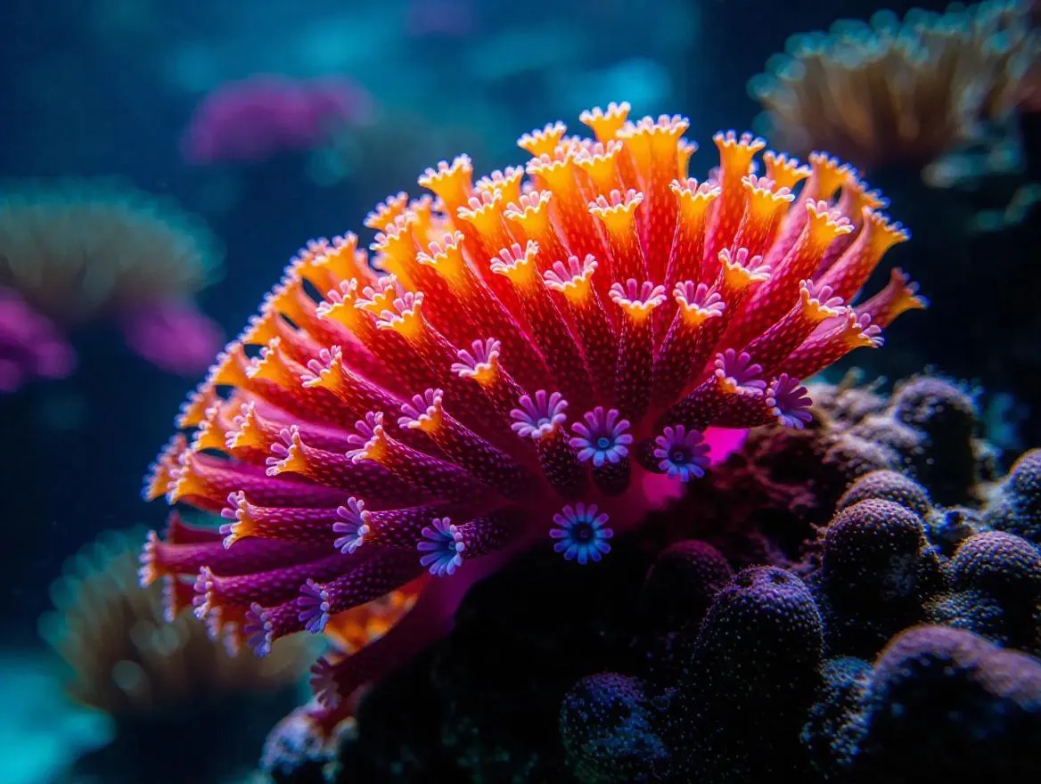 Deep sea coral reef, vibrant fish passages, sparkling bioluminescent flashes, mesmerizing sea life, rich marine biodiversity, crystal-clear waters, colorful corals, dynamic underwater ecosystem, captivating underwater scenery.