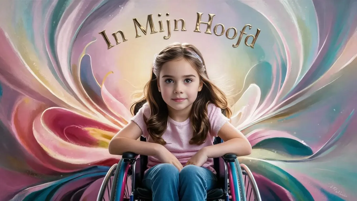 Create an AI-generated book cover featuring a 12-year-old wheelchair-using girl with text "In Mijn Hoofd" (In My Head). Inspire inclusive storytelling through vibrant visuals and heartfelt themes. Perfect for authors seeking professional-grade designs celebrating diversity, youth perspectives, and AI-powered creativity.