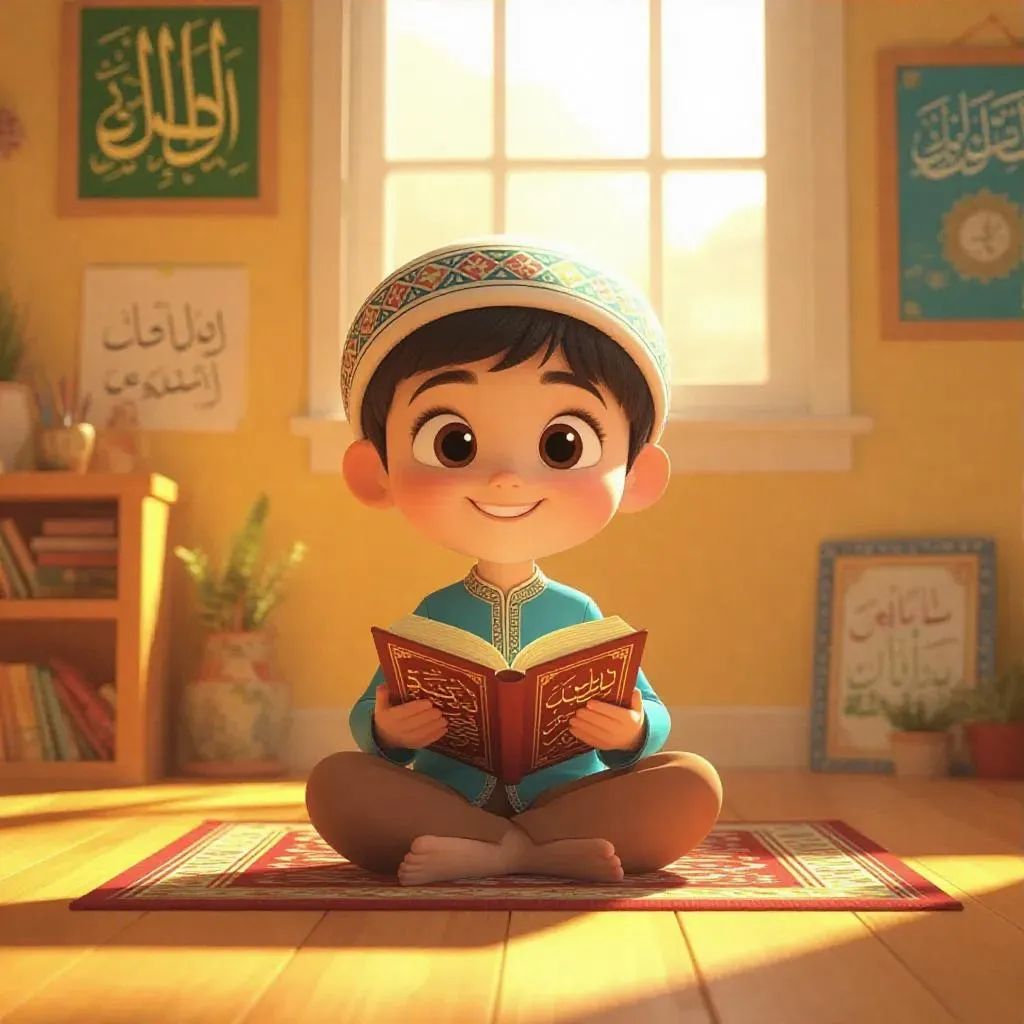 Create vibrant Islamic educational cartoons with AI! Generate cheerful kids in traditional attire learning Surah Al-Fatiha in cozy sunlit rooms featuring Arabic alphabets, Quran study, and Islamic symbols. Whimsical, child-friendly art style with bold outlines, bright colors, and peaceful atmosphere for modern animated content.
