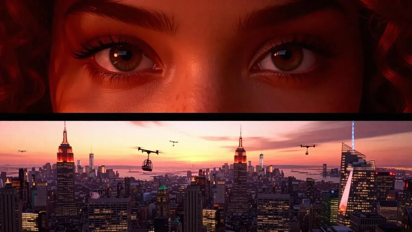Generate AI-powered cinematic visuals with split compositions blending detailed character portraits (cross-hazel eyes, crimson lashes) and dystopian metropolises. Merge New York landmarks, jagged skyscrapers, monorails, surveillance drones, and saturated red tones using realistic rim lighting. Perfect for AI-driven urban dystopia art, hyper-detailed scenes, and dramatic red-lit atmospheres.