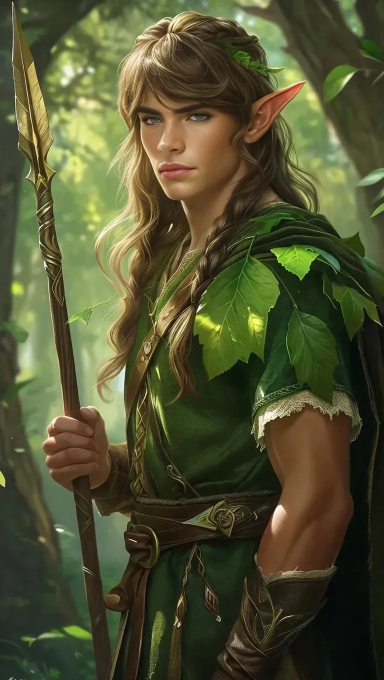 Generate a semi-realistic AI image of a mystical male elf with pointed ears, flowing hair, and leaf attire, wielding an elven spear. Perfect for fantasy art, RPG characters, or digital storytelling. Create ethereal tan-skinned fairy warriors effortlessly with VivaGo's AI-powered image generator for mythical, professional-grade visuals.