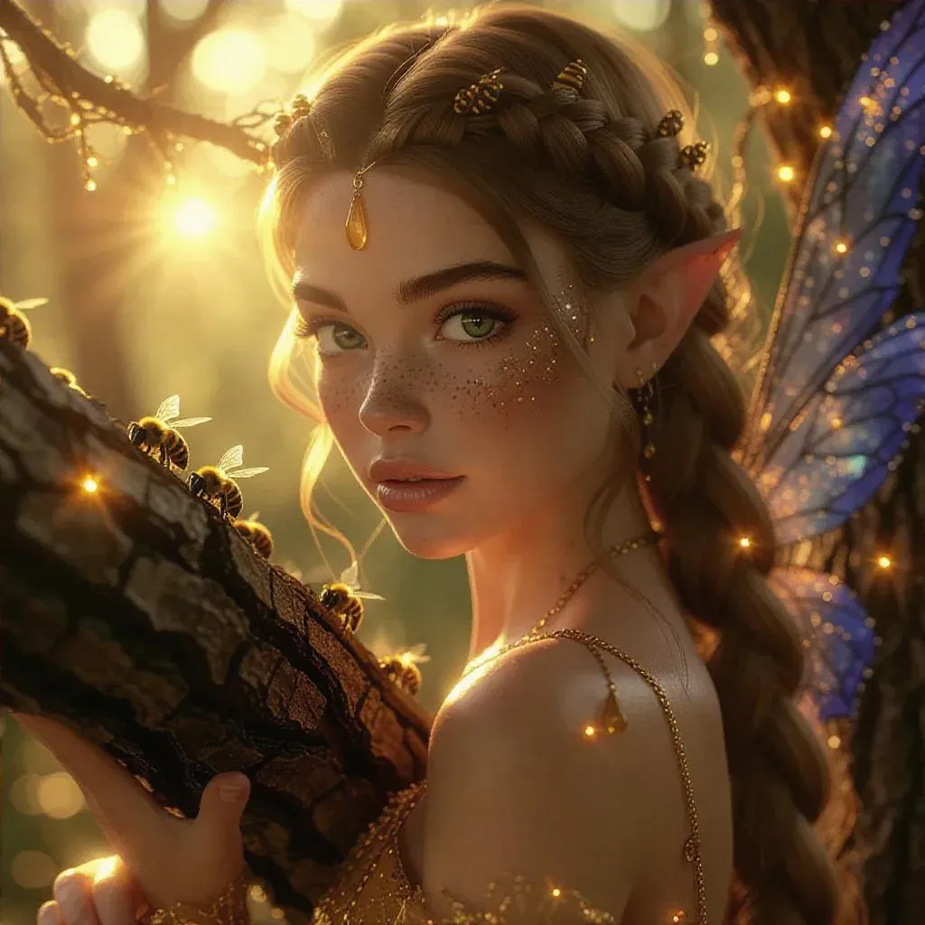 Create an AI-generated fantasy artwork of a honey and bee princess with intricate wings, elf ears, and a fairy costume in an enchanted forest. Featuring expressive eyes, porcelain skin, glowing fireflies, and a serene pond. Transform text into magical visuals with vivago.ai's professional AI tools for ethereal, high-detail fantasy imagery.