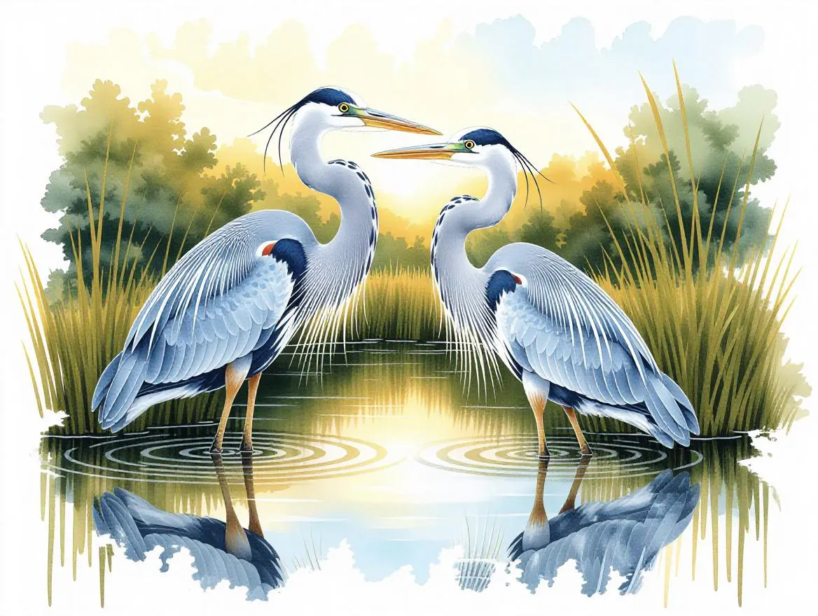 Generate a stunning fantasy portrait landscape of two herons in love with vivago.ai's AI watercolor effect, blending Audubon's naturalism with Welz-Stein's whimsy. Ultra-detailed golden foil accents, luxury riotous colors, and signature splashy white borders evoke Nickerson's elegance, Morris' patterns, and Grimwood's romanticism for mesmerizing AI-generated art.