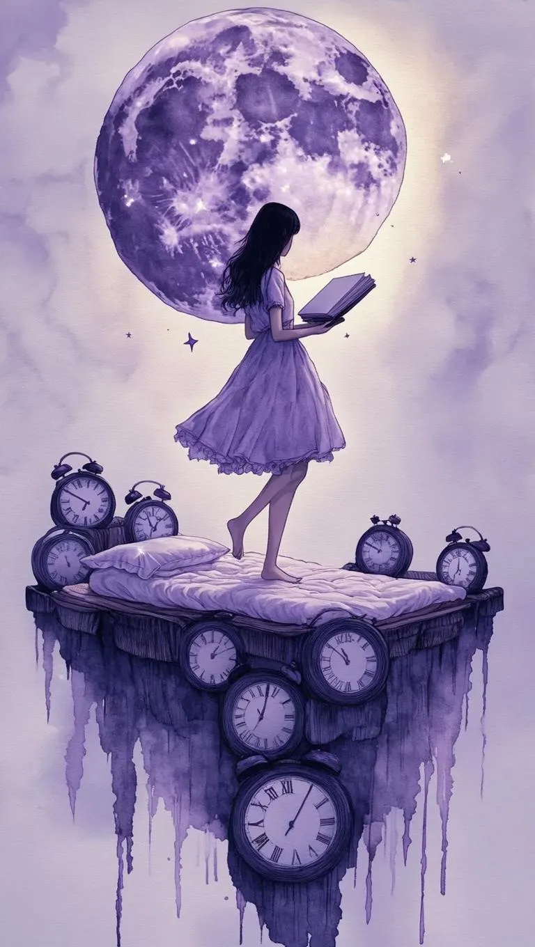 Experience a surreal anime-inspired scene of a girl walking barefoot on a floating island of beds and clocks. Witness cinematic watercolor visuals with a starlight-flickering book, tearing paper moon, and dissolving memories. Vivago.ai's AI tools transform poetic prompts into dreamlike animations with lavender ink washes and fog-laced contours. #Anime #Cinematic #Watercolor