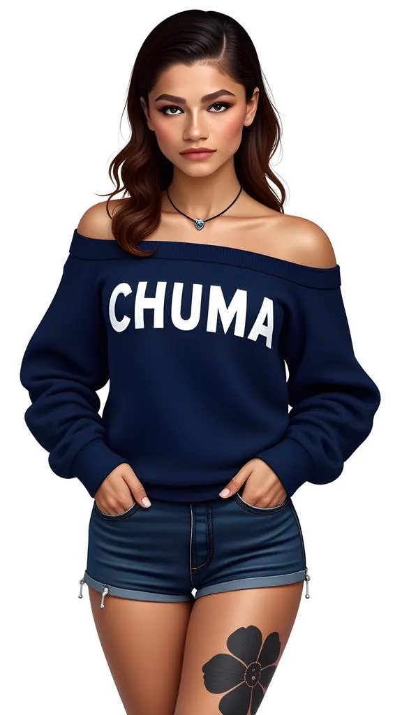 Create striking AI-generated digital illustrations of a confident young woman in a dark blue off-shoulder sweater with "CHUMA" text. Highlight perfect proportions, detailed arm/leg tattoos, and a serious pose against a minimalist white background for professional-grade AI art.