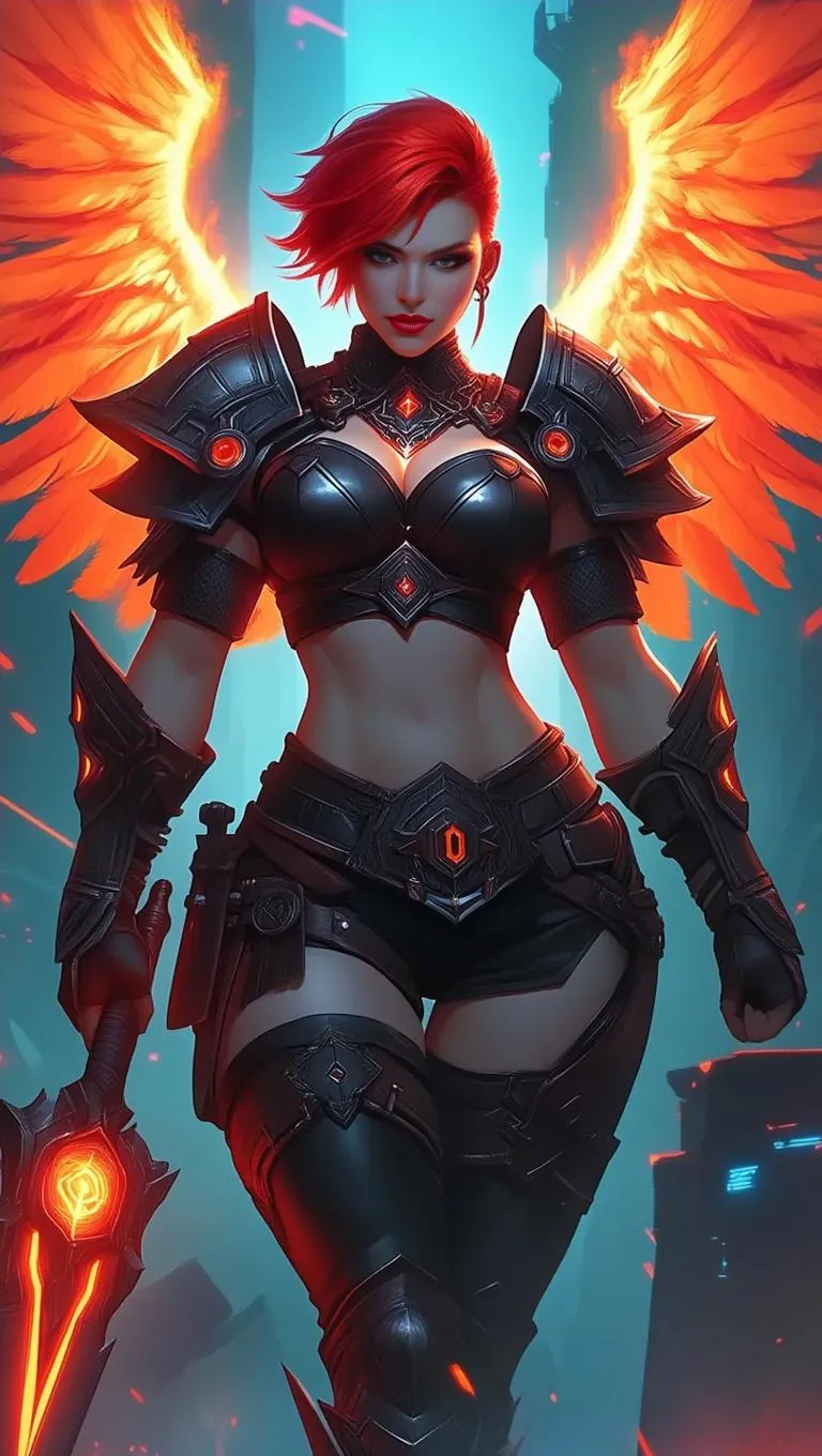 Create a beautiful bulky female Barbarian warrior with fiery wings and short red hair, inspired by Diablo 4. Fusion Anime, Cyberpunk, and League of Legends styles. Generate vibrant 8K visuals with Vivago.ai's AI image generator for game concept art. Transform prompts into professional-grade game-style characters.