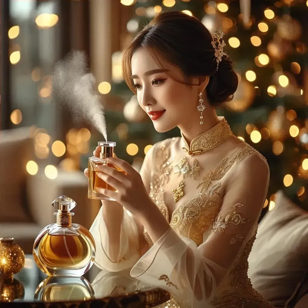 Create festive AI-generated visuals of a Chinese model posing with perfume in a Christmas-themed living room. Perfect for holiday marketing content, seasonal branding, and professional product photography using vivago.ai's AI image tools for lifelike details and atmospheric scenes.