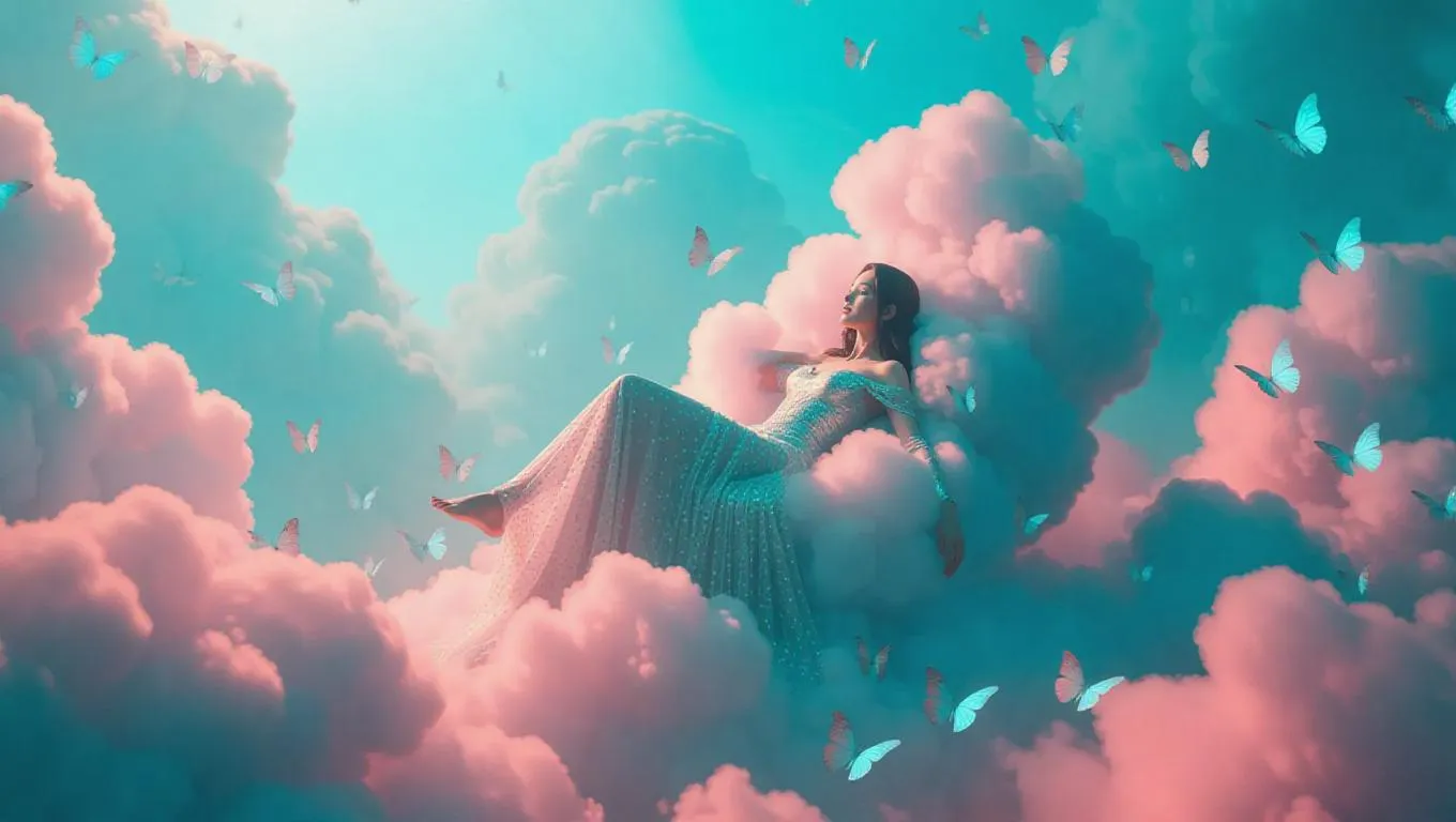 Suspended amidst an ethereal, cotton-candy-hued cloudscape, a lone, regal figure reclines on a wispy, cumulus throne, surrounded by fluttering, iridescent butterflies and a tangled, gossamer veil of cloud-strands, turquoise and rose-hued mist swirling, curling around their majestic form, set against a brilliant, cerulean expanse, viewed through a dreamy, soft-focus lens, surrealismo fantascientifico.