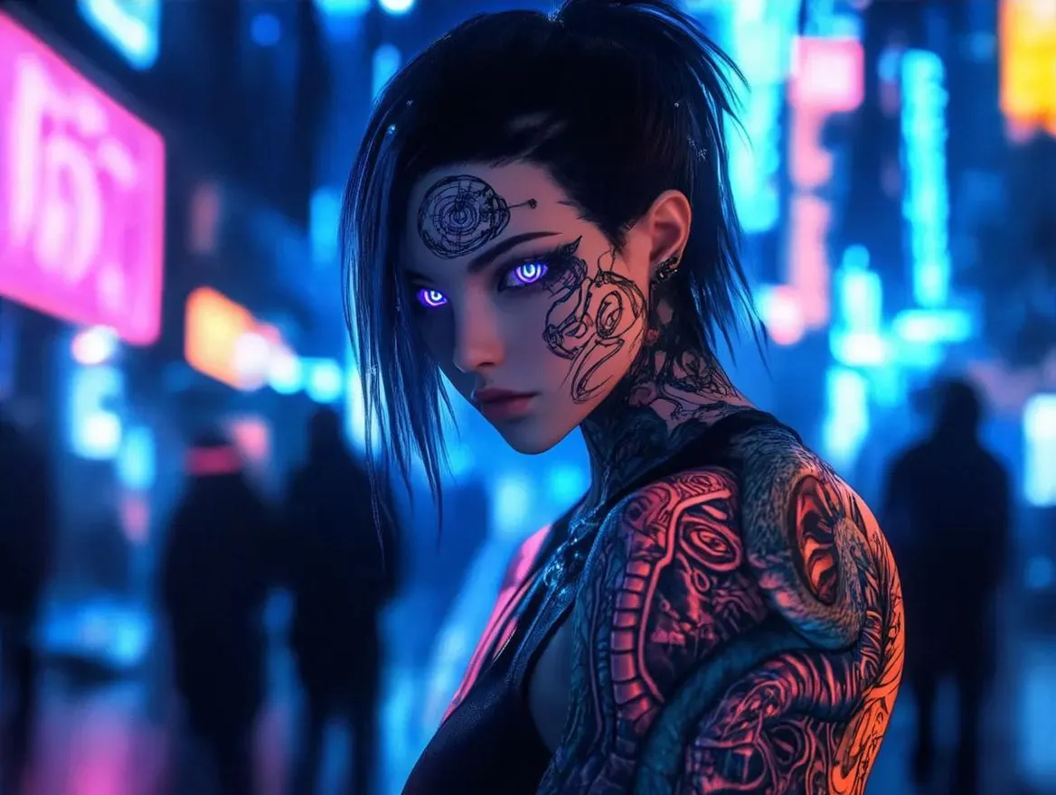 Vivid cyberpunk anime characters with intricate Singularity tattoos navigate neon-lit futuristic cities. AI-generated art blends dynamic anime styles, cyberpunk aesthetics, and symbolic body art. Explore sleek character design, glowing neon contrasts, and humanity-meets-technology themes. Create striking visuals with warm/cool tones, sharp gestures, and ambient lighting via AI anime art generators for immersive storytelling.