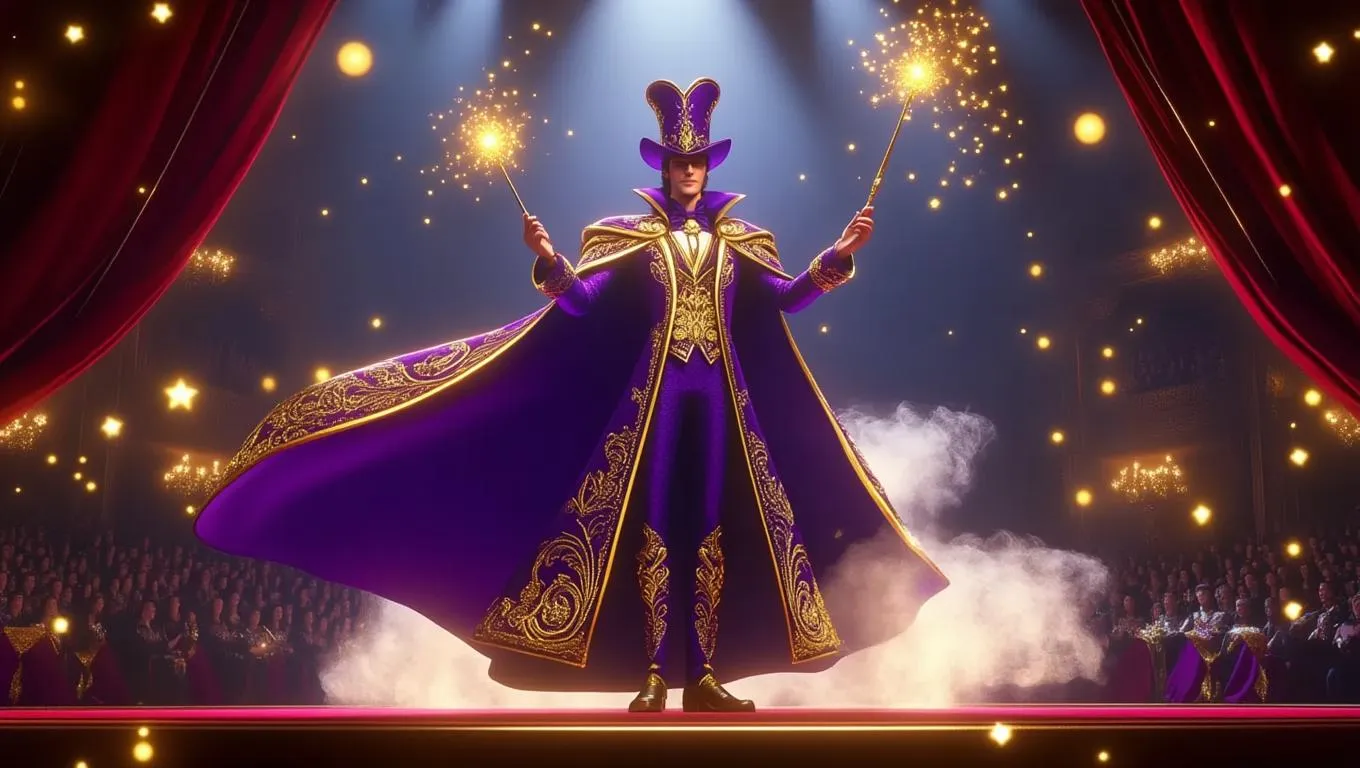 Vivago.ai crafts a mesmerizing 3D magician in dazzling purple-gold attire, wielding a glowing wand with golden sparkles on a grand stage. Enchanting AI-generated visuals feature velvet curtains, mystic smoke, floating stars, and an awe-struck audience. Elevate storytelling with professional-grade magic using text-to-image AI tools for spellbinding, atmospheric effects.
