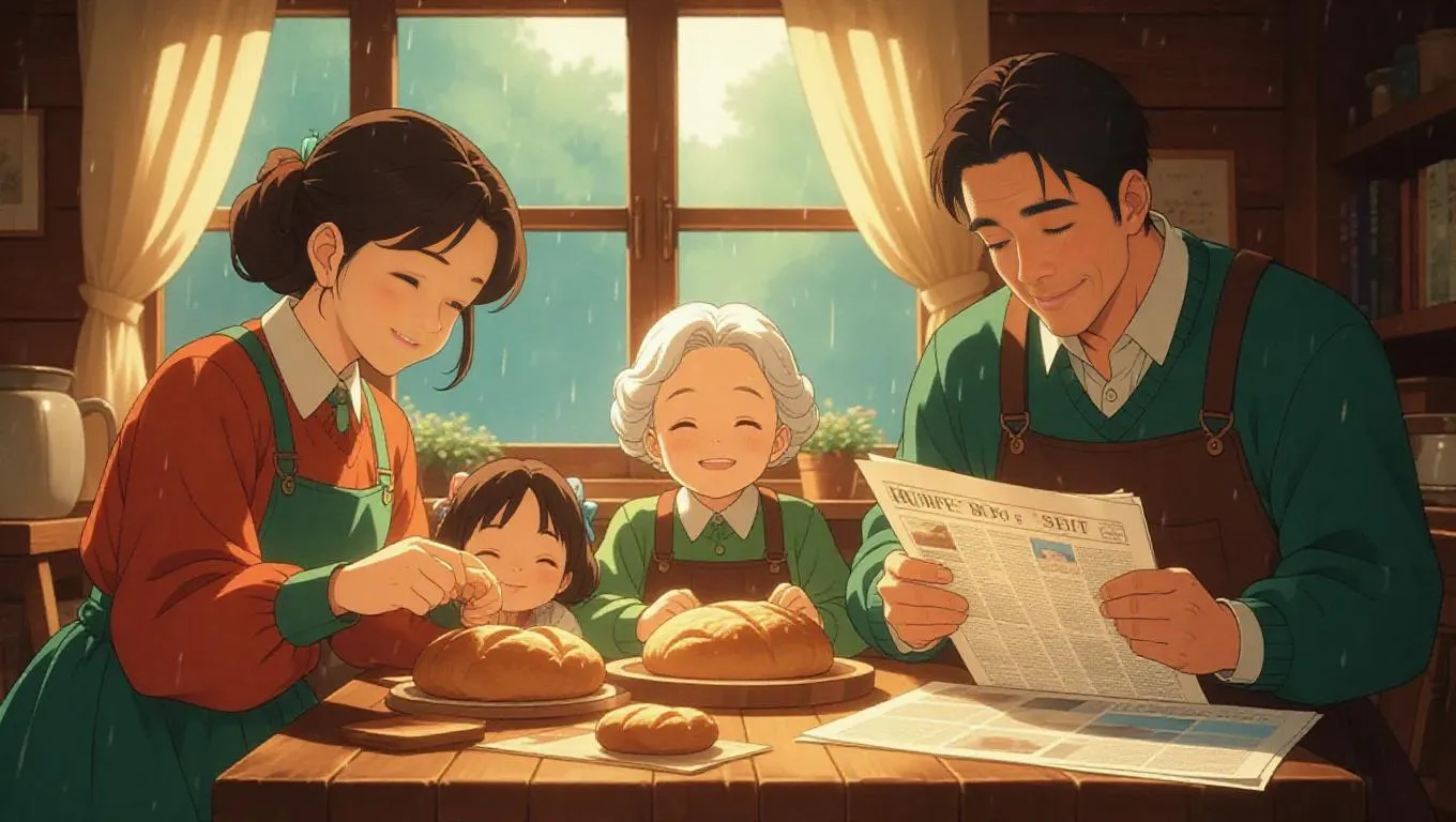 Anime family gathered in a cozy hut, the mother kneading bread, the father reading the newspaper, the grandmother knitting wool, and three children sleeping peacefully. Rain pouring outside, windows opening and closing from the wind, creating a serene and nostalgic atmosphere.