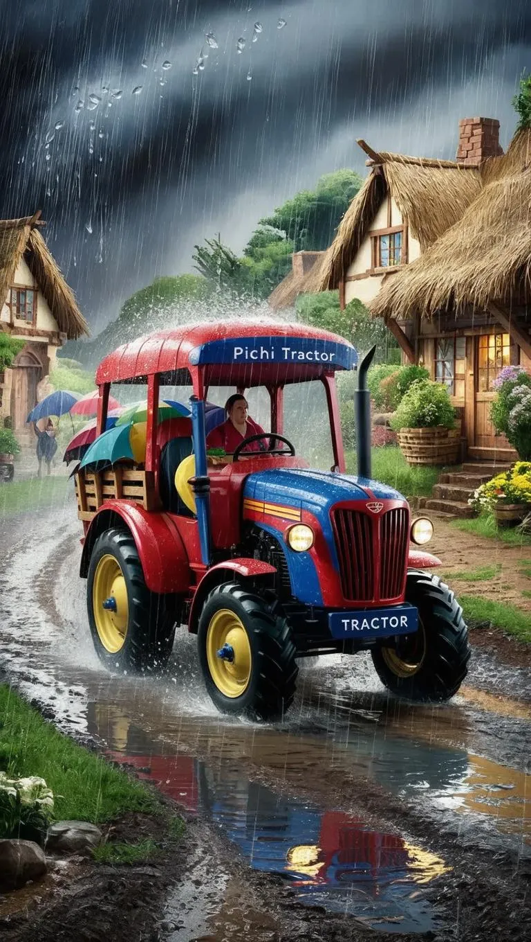 Generate a vivid AI-powered rainy village scene with the iconic red and blue "Pichi Tractor" splashing through puddles, delivering umbrellas and raincoats. Perfect for storytelling or marketing visuals. Explore AI image generation tools for rustic, weather-themed content creation with professional editing effects.