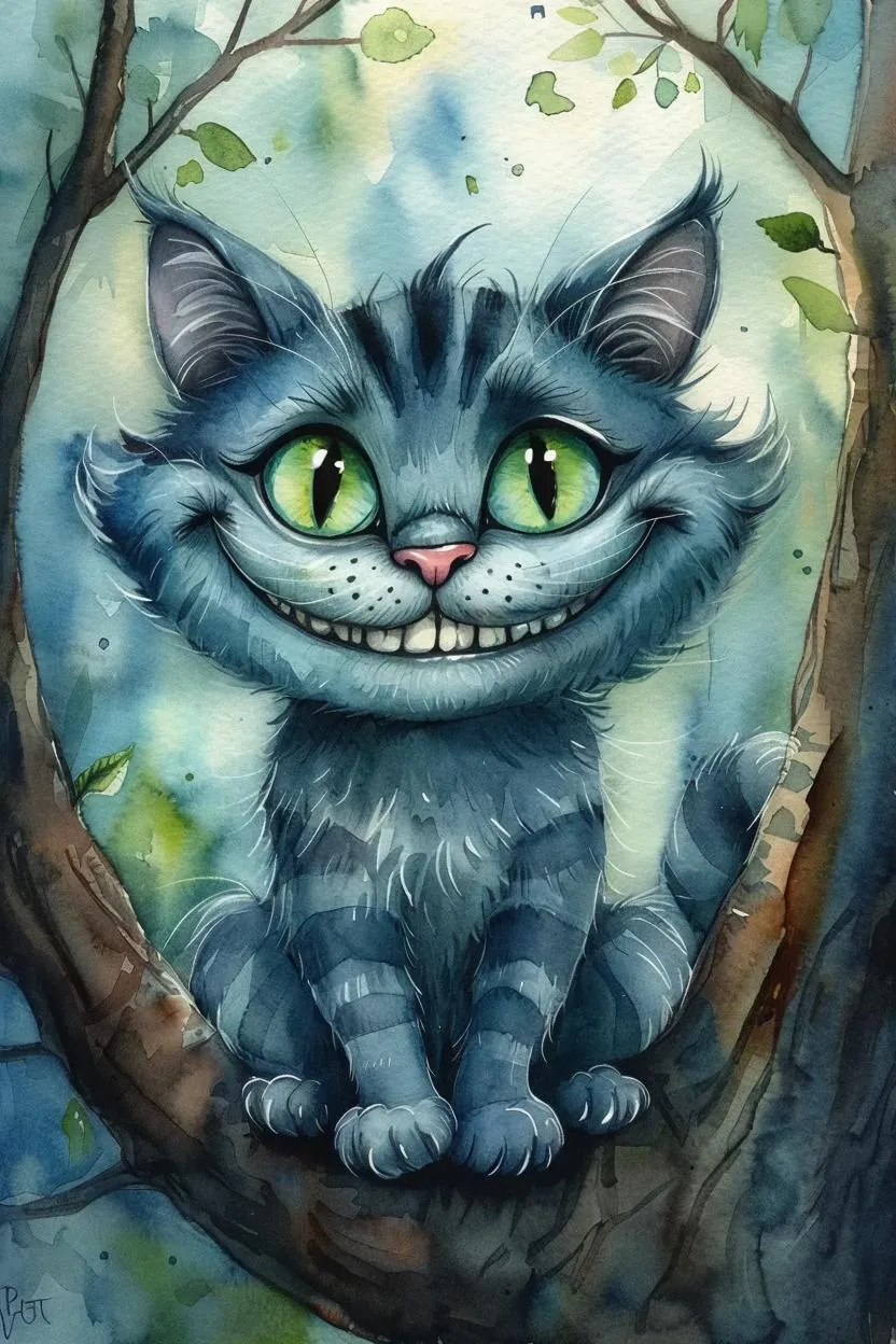 Create a whimsical watercolor cartoon Cheshire Cat with a large grin and bright green eyes, perched on a tree branch. Transform text prompts into vibrant AI art using vivago.ai's tools for playful, surreal visuals and professional editing effects.